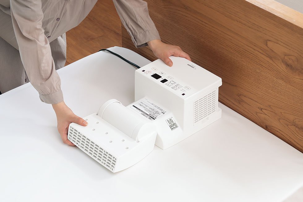 そこで、手軽に使いたいという方におすすめなのは「マットなし・ホースなし」の布団乾燥機。このタイプは、本体を開いて、送風口を敷き布団と掛け布団の間に挟み、モードを選択してスタートするだけなので、とにかく使い方が簡単です。また、持ち運びや片付けにも時間がかからず、コンパクトに収納することができるのも魅力的です。