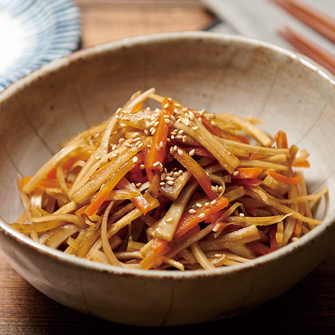 1の皮目を下にして横長に置き、2等分にしたきんぴらごぼうをそれぞれにのせて手前から巻く。