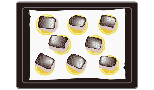 角皿にクッキングシートを敷き、輪切りにしたレモンを並べ、その上にたらの皮目を上にしてのせる