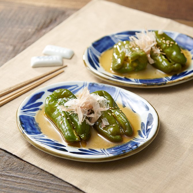 ピーマンは手のひらで軽くつぶし、味が染み込みやすいように裂け目を作る