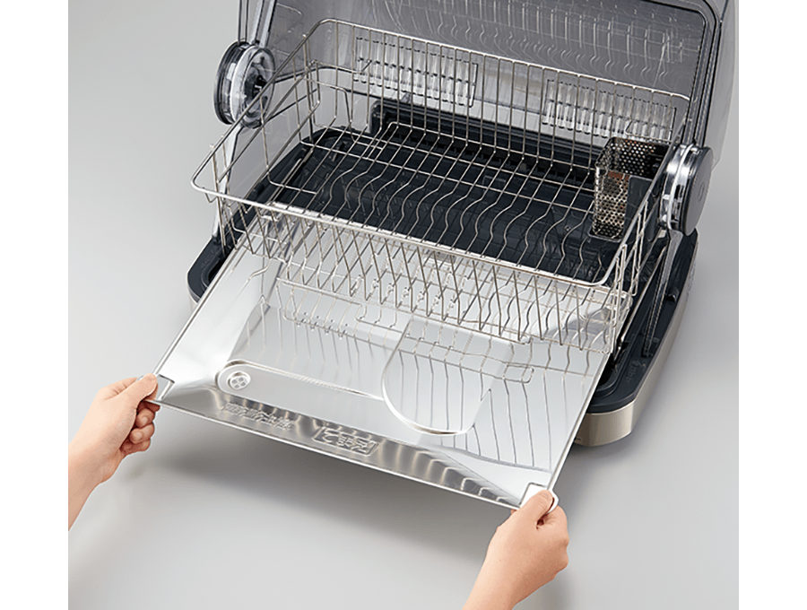 お手入れラクラク、食器かごをセットしたまま引き出して洗える「ステンレストレー」
