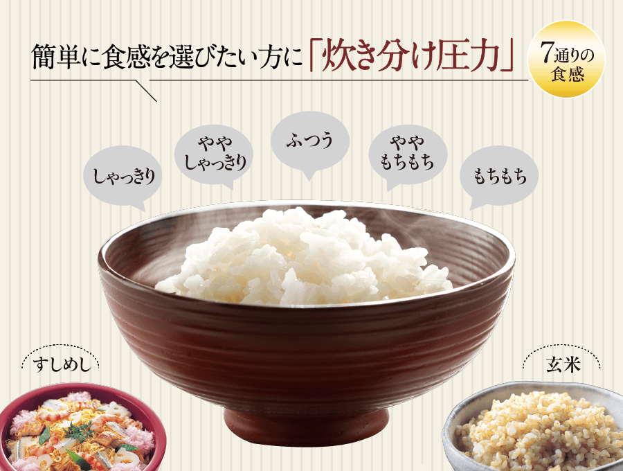 しゃっきりからもちもちまで好みの食感に炊き分ける7通りの「炊き分け圧力」