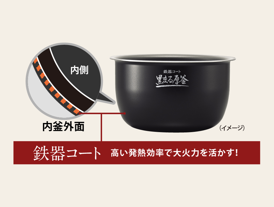 釜全体に熱が伝わる形状に加え、IH加熱と相性の良く、発熱効率の高い鉄を釜外面にコーティングし、炊きムラを抑えます。