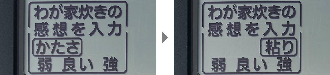 前回のごはんの感想を、「かたさ」・「粘り」の項目から選びます。